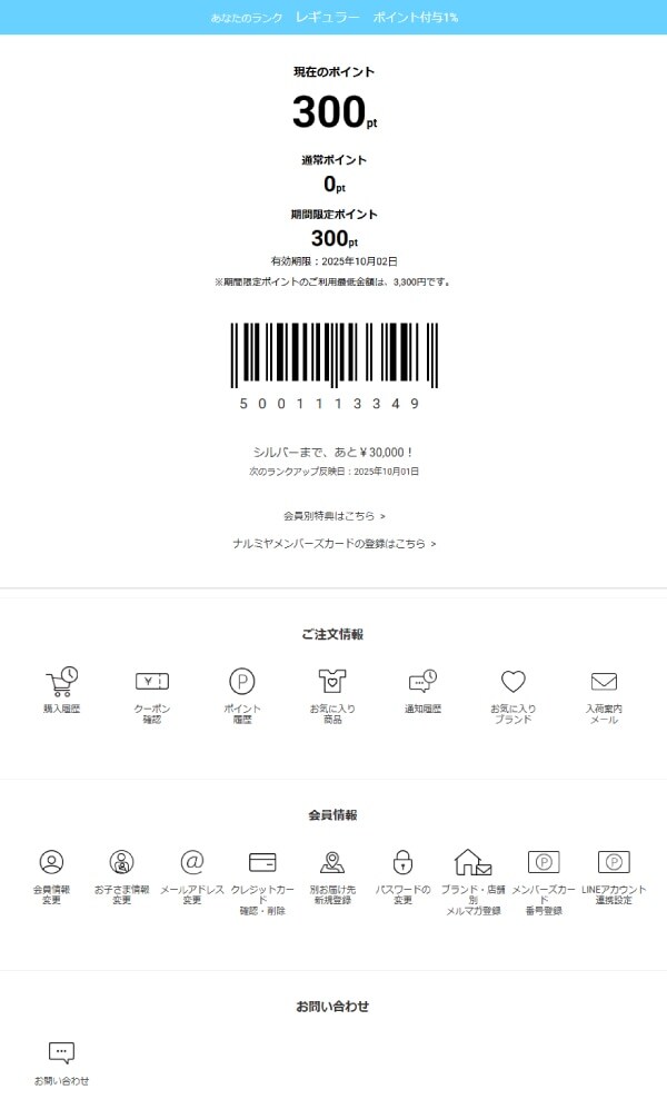 会員ランク、総保有ポイント数(通常ポイント、期間限定ポイント)の確認ができます。